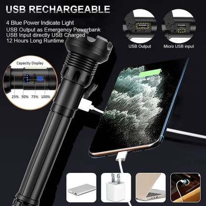 Rechargeable Flashlight High Lumens. 10000 m-a-h large capacity Ba-tt-ery for a long life. this LED rechargeable flashlight could run up to 72hours. USB input port allow you quickly charge the flash light and the USB output port help this led flashlight work as a emergency power bank to charge your phone. camera and etc.
