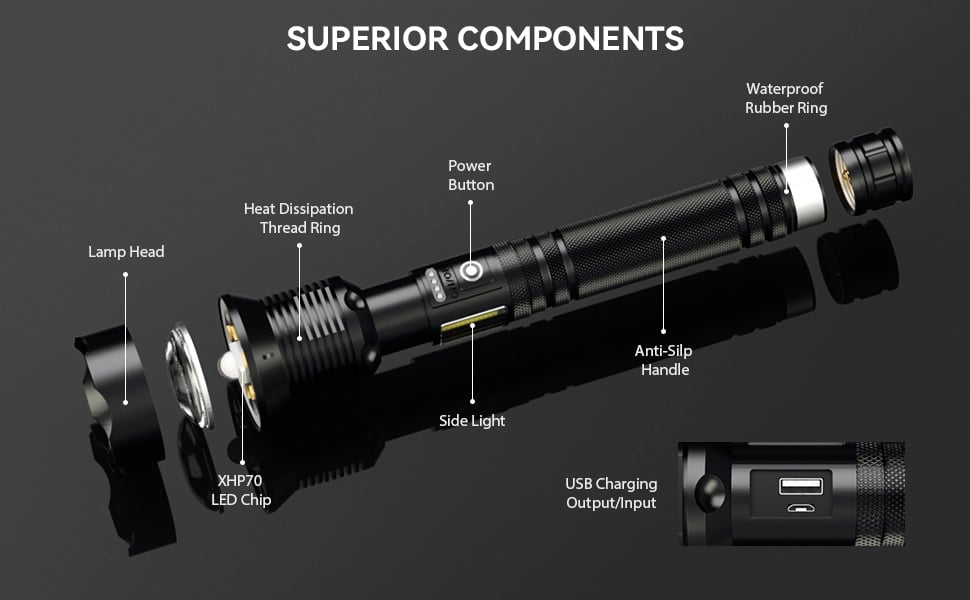 Amazing Illumination: With 90000 Lumens. Professional LED flashlight is strong and sturdy.